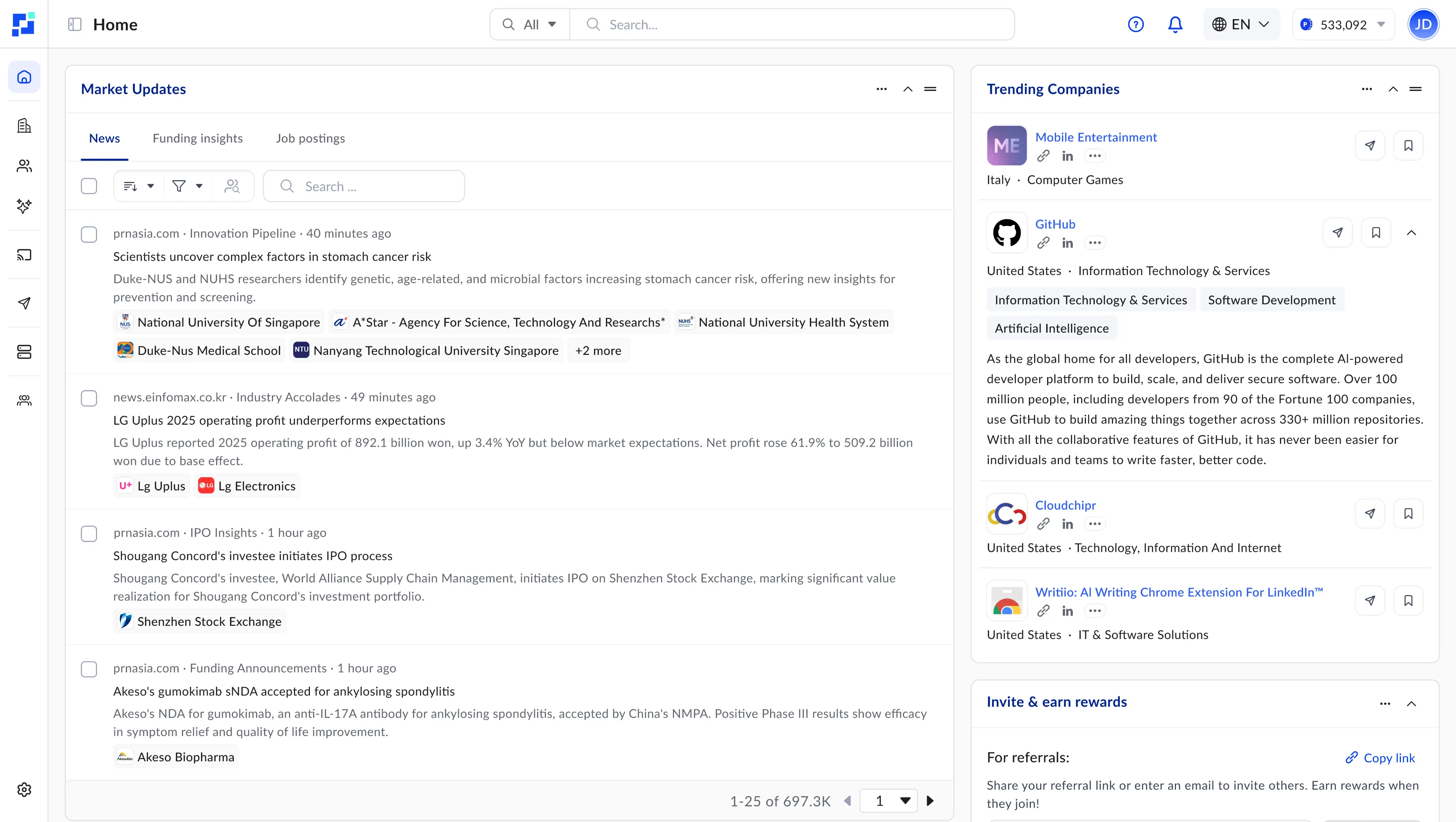 Access 120K+ daily signals including news, funding, jobs, tech trends, and competitor tracking to uncover new business opportunities quickly.