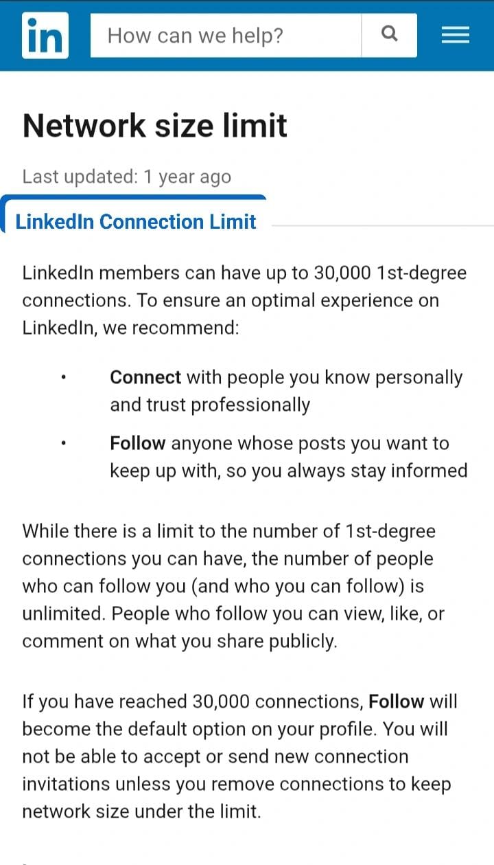 - Maximum Connections: Up to 30,000 connections per LinkedIn account. This puts a ceiling on how large your network can grow organically.