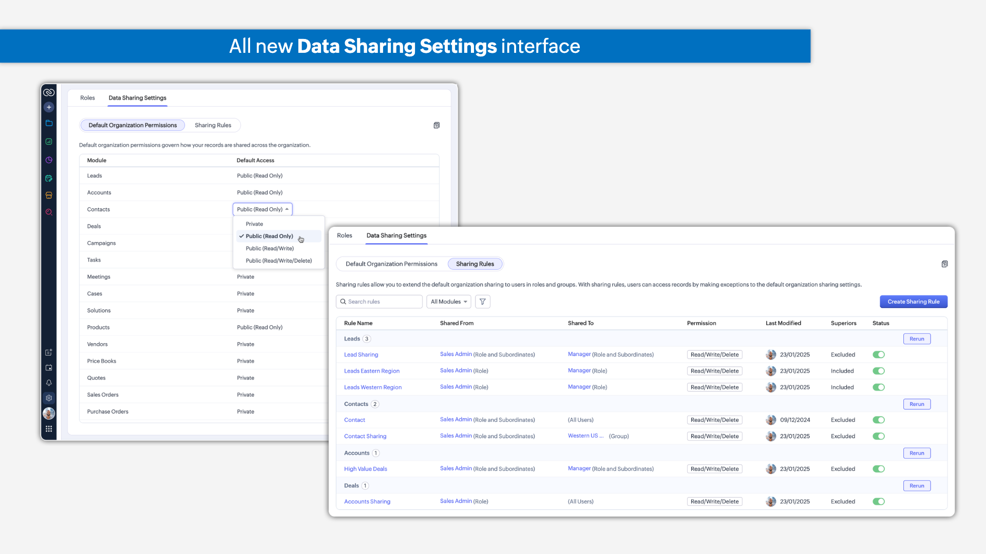 Managing sensitive customer data is easier with improved data sharing rules, module-level visibility, and enhanced UI for one-click rule activation and cloning.