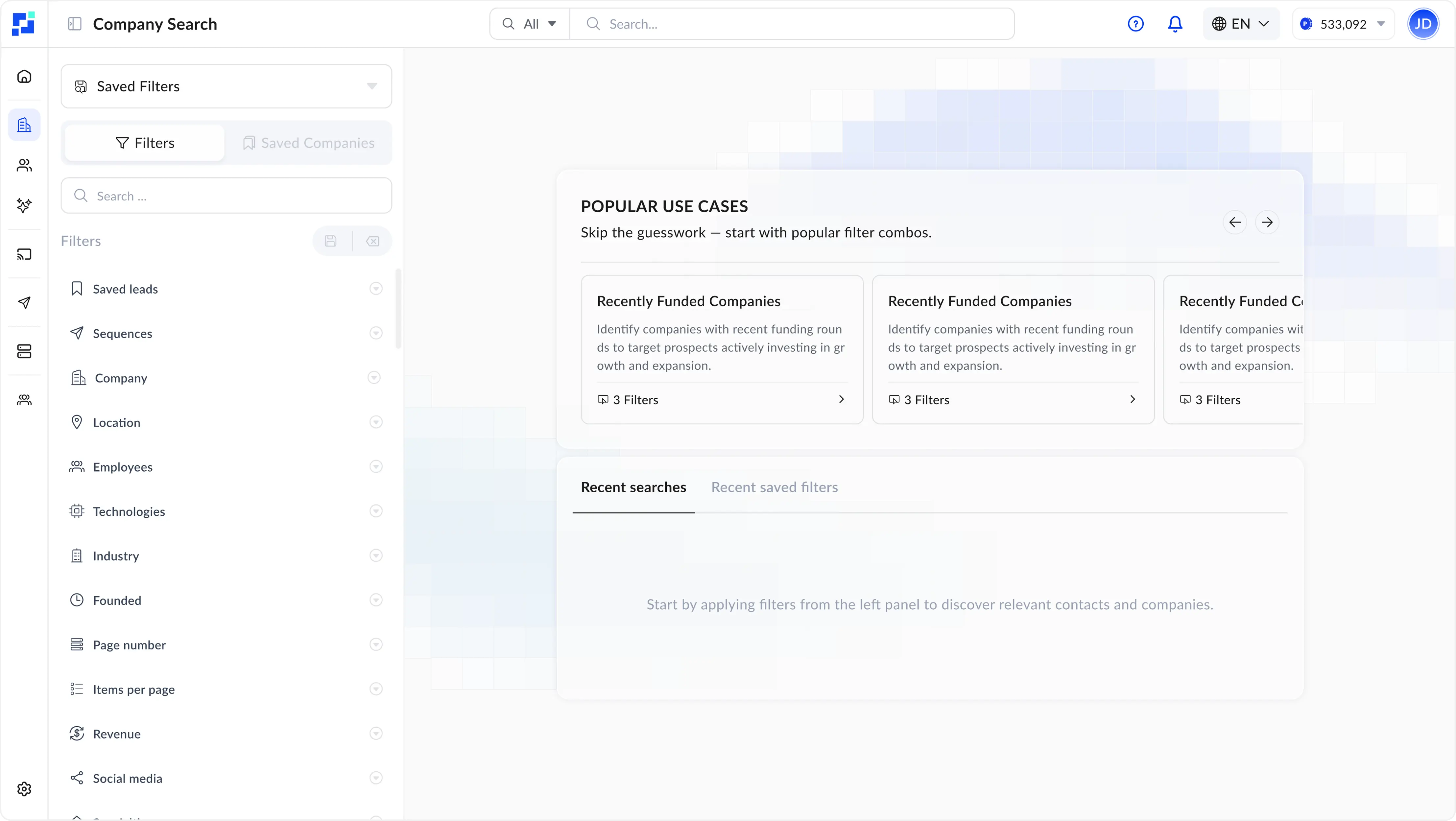 Use smart filters (industry, company size, job title, location, technologies used, funding, and more) to narrow down to only the most relevant prospects.